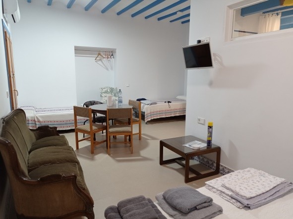 HV o TERRAZA, cama individual con nido individual, 13,74 m2, con saloncito, el baño 6,62 m2, mas terraza  20,89 m2 (acceso ocasionalmente limitado) con sillas, vista al huerto y montaña, ventilador y estufa eléctrica, perchero y estantes, lamparitas de mesa, armarito auxilia.