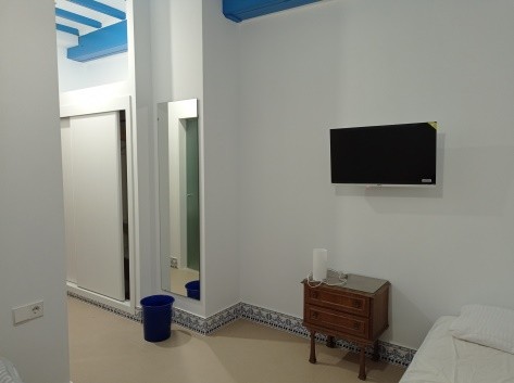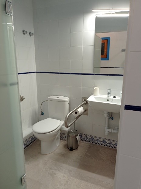 HABITACIONES ACCESIBLES y ADAPTADAS EN PLANTA BAJA DE LA CASA DEL ESCRIVA. EQUIPAMIETO HABITACIONES, puertas y pasos accesibles, cuadro eléctrico, elementos de iluminación, entrada, dormitorio y baño, este en uso exclusivo y adaptado, ducha con silla y asas, ACS, inodoro accesible y espejo, secador de cabello, toallas (mano y ducha), cama de matrimonio y/o individual, con ropa de cama y abrigo (cubierta, manta, edredón), mesita de noche, lámpara sobremesa,  TV con mando, sillas y mesa de servicio, papelera, elementos de limpieza, Wi-Fi, y calefactor de agua y microondas