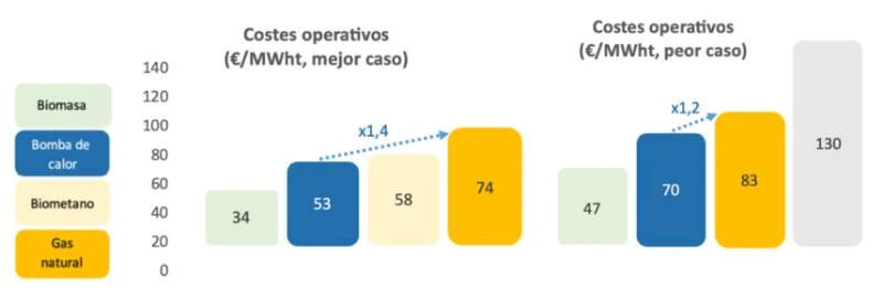 Según AVEBIOM, los biocombustibles sólidos fueron la opción más competitiva para calefacción en 2022 incluso en los momentos en los que los precios del pellet y del hueso alcanzaron sus máximos históricos, en contra de la percepción de algunos usuarios. De hecho, calentarse con gas natural en 2022 fue un 44% más caro que hacerlo con pellets, y hacerlo con radiadores eléctricos, por ejemplo, costó el triple que calentarse con pellets.